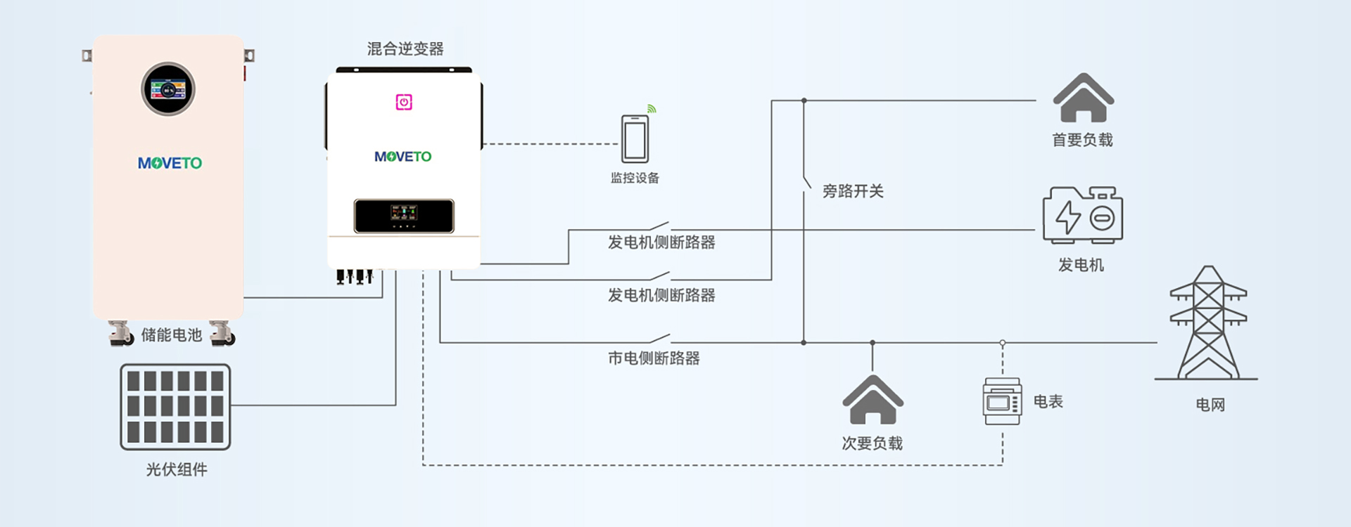 MoveTo.Solar 美途光伏的家庭储能系统为房主提供了可靠且可持续的能源解决方案。通过将先进的电池技术与智能能源管理软件相结合,该系统允许用户在白天储存多余的太阳能,并在高峰需求或夜间无缝访问。这确保了稳定的电力供应,降低了能源成本,并最大限度地提高了可再生能源的使用效率,从而更好地控制了家庭能源消耗。